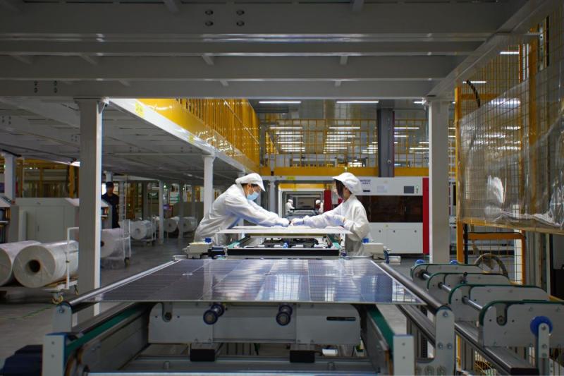 在安徽省滁州市凤阳县一家光伏企业内,工东说念主在出产线上高深(2023年6月14日摄)。新华社发
