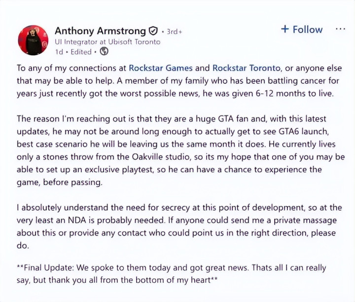运道的是,这位粉丝的居住地,距离Rockstar Games位于奥克维尔的责任室十分近。为了圆他临了的心愿,家东谈主饱读起勇气向Rockstar Games建议苦求,但愿能为他争取一次专属试玩契机,让他在生命绝顶亲自体验这款铭肌镂骨的游戏。