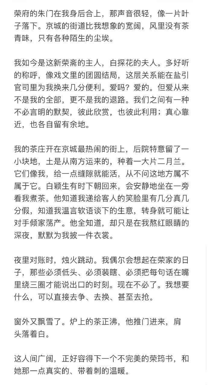 张南绝顶贴心的写了一篇荣筠书跟白颖生在京城的昔时,一个开茶庄作念交易,一个当官。两个东谈主互相抚玩互相期骗,由衷围聚却留多余步。
