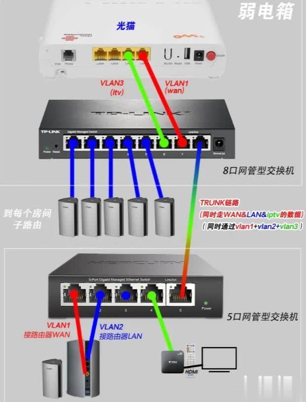 领先,从弱电箱到客厅一定要预留至少两根网线,其余房间预留一根就行了。宽带接通明,光猫放到弱电箱,路由器放到客厅里,客厅的两根网线一根插在路由器的WAN口,另一根插在路由的LAN口,这么就不错将荟萃复返到弱电箱里,然后在弱电箱里再摒弃一个千兆交换机,将接入到每个房间的网线王人插在交换机上,这么每个房间的网口王人有了荟萃,不会出现信号卡对的征象。