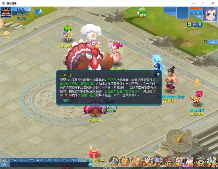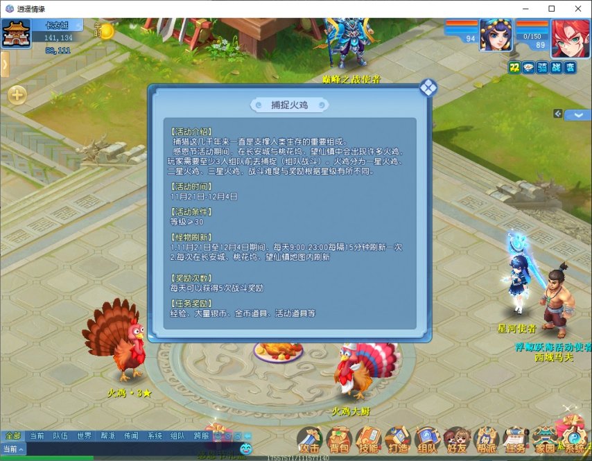 几千年来,捕猎一直是守旧东谈主类糊口的进攻看成。感德节看成技术,在长安城与桃花坞、望仙镇中会出现好多火鸡,玩家需要组队前往捕捉。火鸡分为一星火鸡、二星火鸡、三星火鸡,斗争难度与奖励把柄星级有所不同,逐日奖励上限5次。