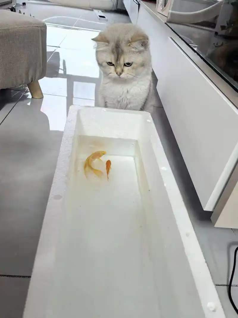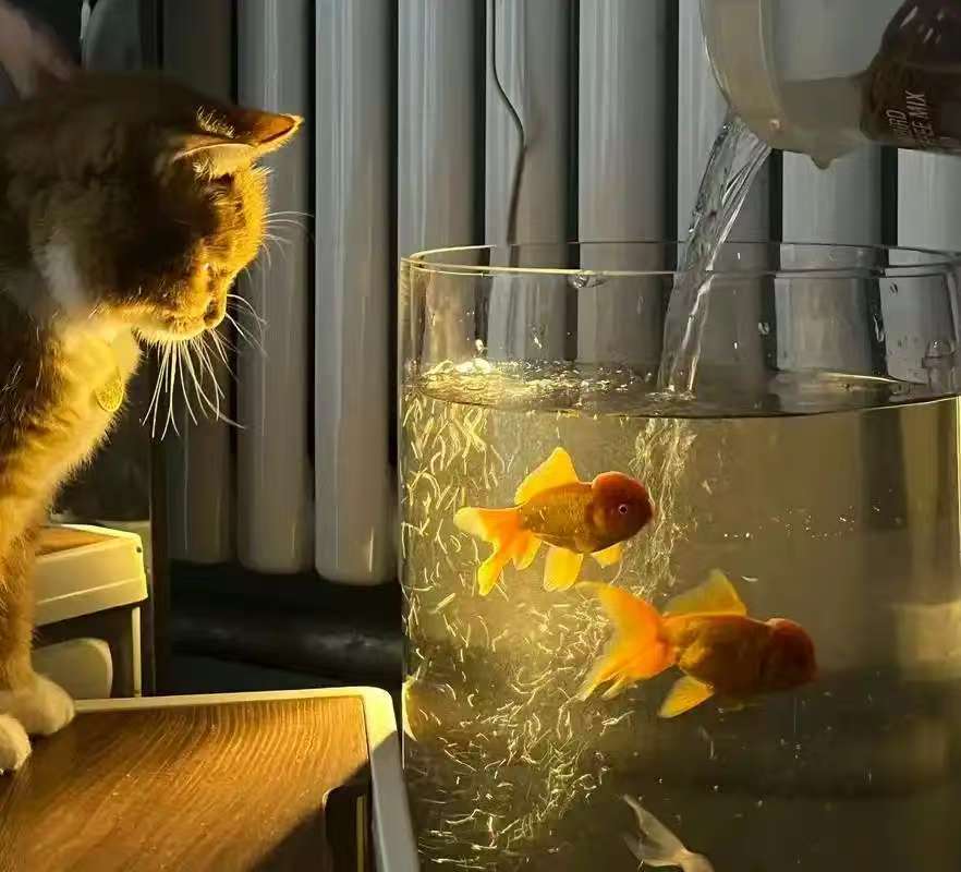东说念主看鱼养息,猫看鱼也养息。东说念主看着猫和鱼,那就更养息啦。